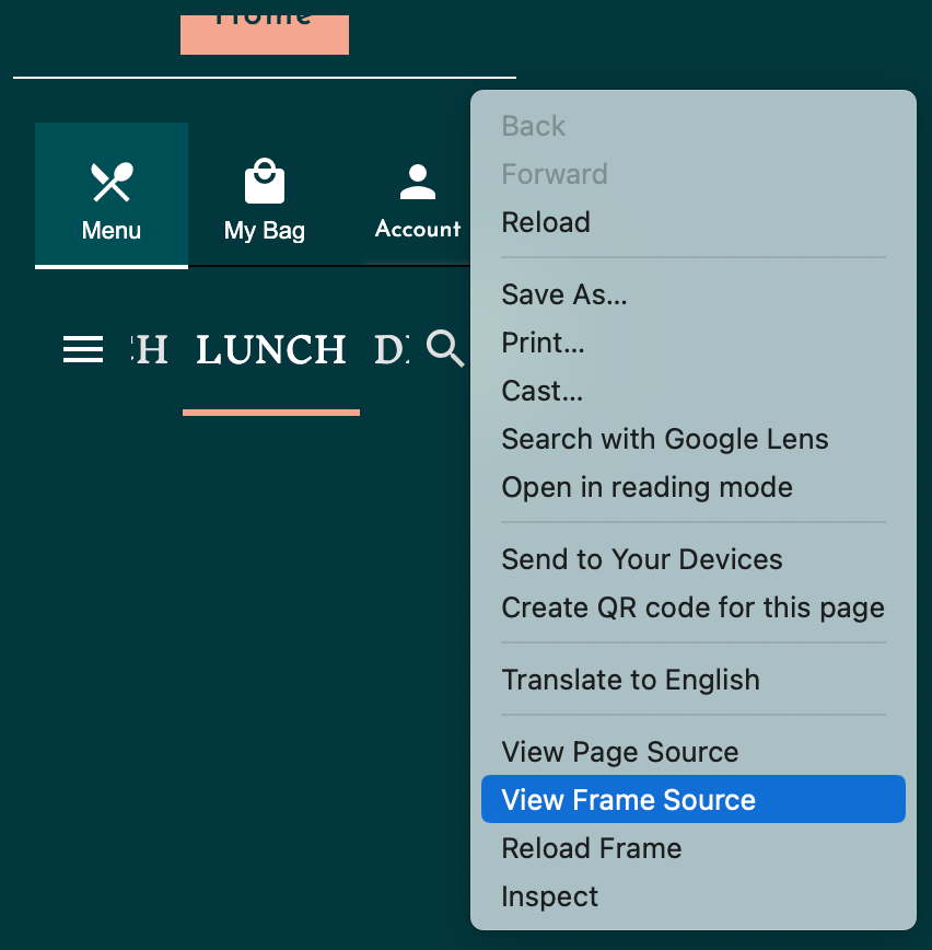 Right-click on the displayed Zuppler online menu and select View Frame Source.